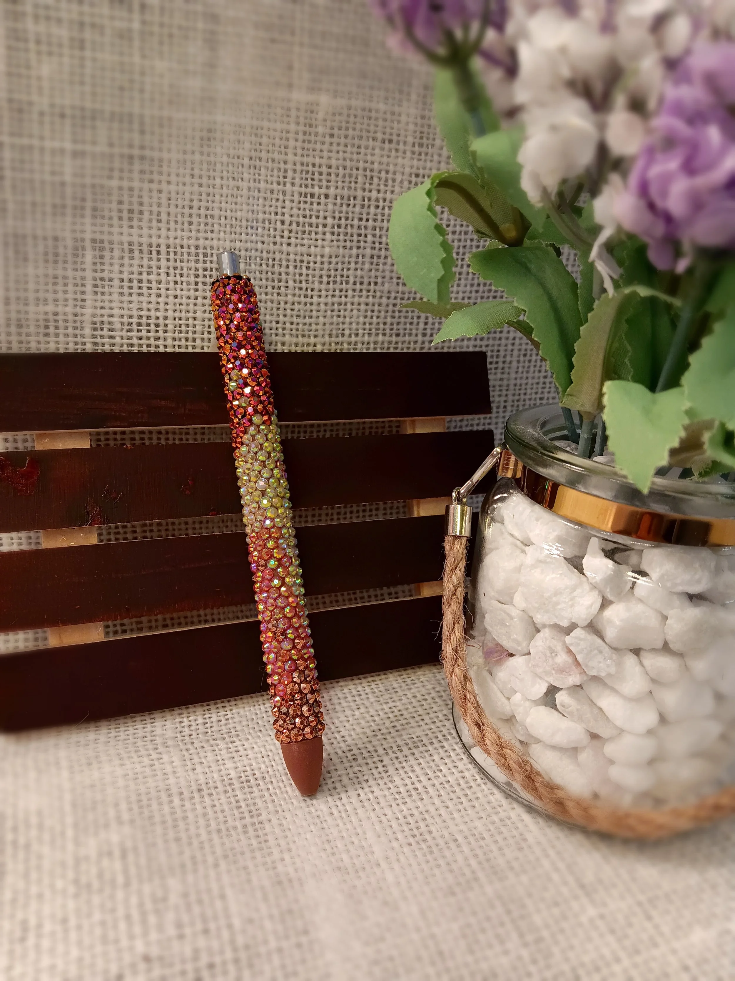 Image 1 of 1 Hand-crafted Rhinestone Pen $12.00 Hand stoned pen. Brown ink. Refillable. Ink Joy gel. Add To Cart Added! Hand stoned pen. Brown ink. Refillable. Ink Joy gel.